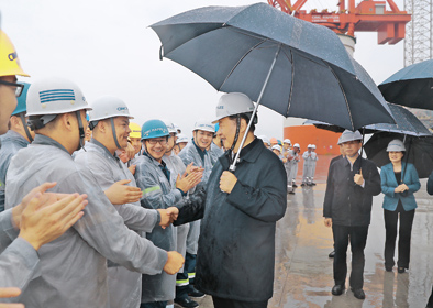 ▲6月12日至14日,中共中央总书记、国家主席、中央军委主席习近平在山东考察。这是13日下午,习近平在中集来福士海洋工程有限公司烟台基地,冒雨察看海洋工程设备建设场地,并同现场的工人们亲切握手。